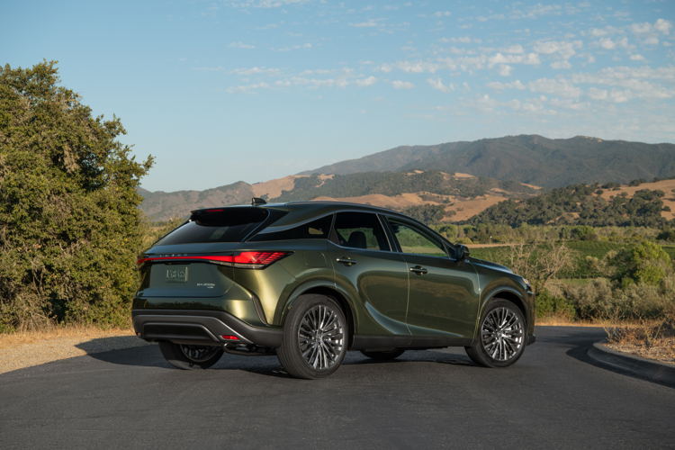 L'effet caractéristique de « toit flottant » du RX, créé par un montant arrière noirci, est conservé, mais son aspect tridimensionnel est renforcé. L'arrière de la voiture communique un sentiment de puissance avec un porte-à-faux plus court, une voie plus large (+45 mm) et une transition radicale entre les ailes et les feux arrière. Les feux arrière sont placés dans une barre d'éclairage qui s'étend sur toute la largeur de la voiture et s'enroule autour des coins pour accentuer le look plus large.
